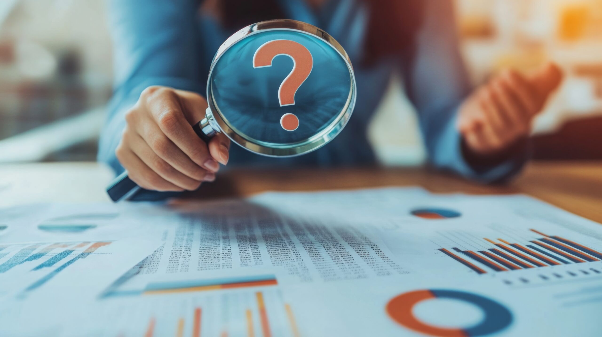 A person holding a magnifying glass with a question mark, analyzing financial graphs and data on a desk. ©stock.adobe.com ©stock.adobe.com