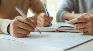 Collaborative study session with two young adults writing notes