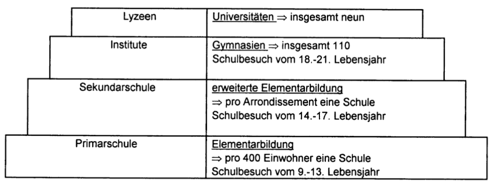 - Institutionell soll nach Condorcet das Bildungssystem in fünf Stufen gegliedert sein, die Primärschulen, die Sekundärschulen, die Institute, die Lyzeen und die Nationale Akademie der Wissenschaften und Künste, die allerdings nur noch insofern ein Bildungsinstitut ist, als sie durch ihre öffentlichen Sitzungen dem Publikum die Möglichkeit zur Weiterbildung gibt; ansonsten dient die Akademie allein der Forschung und der Kontrolle der Bildungsanstalten.