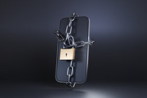 A mobile phone locked by a metal chain and a golden padlock on a black background. Illustration of the concept of digital detox, parental control apps and phone addiction