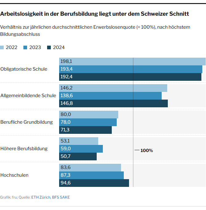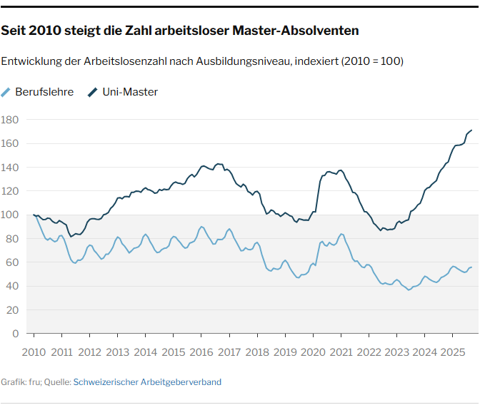 Eine Analyse des Arbeitgeberverbands zeigt, dass die Zahl arbeitsloser Uni-Masterabsolventen seit 2010 um 70 Prozent gestiegen ist. Das lässt sich nur teilweise durch die wachsende Zahl von Hochschulabgängern erklären, die vor allem durch Fachhochschulen getrieben wird. Lehrabgänger erleben das Gegenteil: Ihre Arbeitslosenzahlen sanken im selben Zeitraum um 40 Prozent, obwohl die Zahl der Lernenden laut BFS nur um 6 Prozent zurückging.