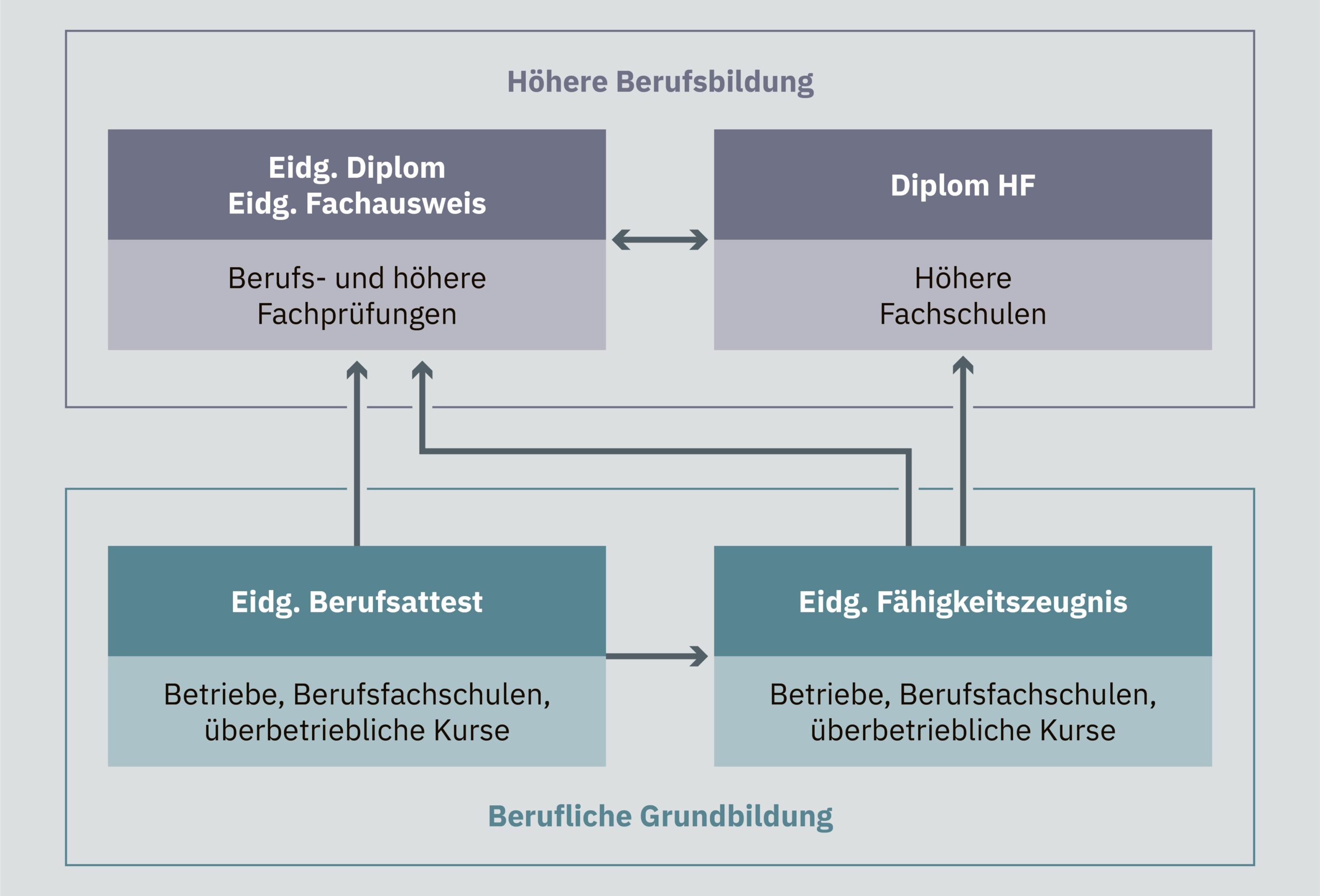 Die Berufsbildung hat zwei Bereiche: Die berufliche Grundbildung umfasst die klassische Lehre, entweder als zweijährige Ausbildung mit eidgenössischem Berufsattest oder als drei- bis vierjährige Lehre mit Fähigkeitszeugnis (EFZ). Die höhere Berufsbildung baut auf dem EFZ oder einem gleichwertigen Abschluss auf. Sie ermöglicht Fachvertiefung, oft nach einigen Jahren Berufserfahrung. Absolventen erwerben von Berufsverbänden organisierte, praxisnahe Abschlüsse, zum Beispiel an einer Höheren Fachschule.