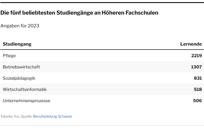 Auch eine aktuelle Studie der Volkswirtschaftsberatung BSS zeigt: Die Bildungsrendite – der finanzielle Gewinn eines Abschlusses abzüglich der Kosten – liegt bei Höheren Fachschulen (HF) mit 23 Prozent über der von Fachhochschulen mit 18 Prozent. Hauptgrund dafür ist laut den Autoren, dass HF-Studierende während des Studiums mehr arbeiten und durch die kürzere Studiendauer schneller in den Arbeitsmarkt einsteigen. Besonders in den Bereichen Technik und Wirtschaft erzielen Berufsleute mit HF-Abschluss hohe Gehälter.