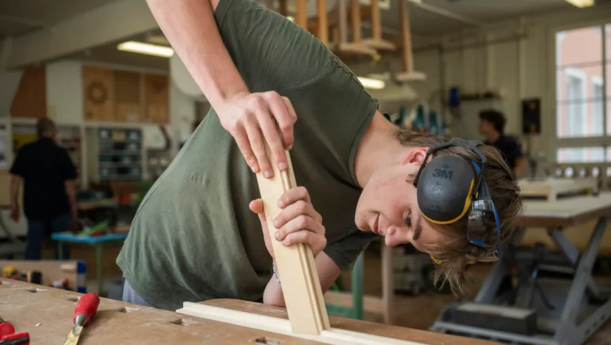 Legende Beitragsbild: Handwerker sind weniger stark von KI betroffen als akademische Berufseinsteiger: Ein Lehrling im Schreiner-Ausbildungszentrum Zürich. (Foto: Urs Jaudas)