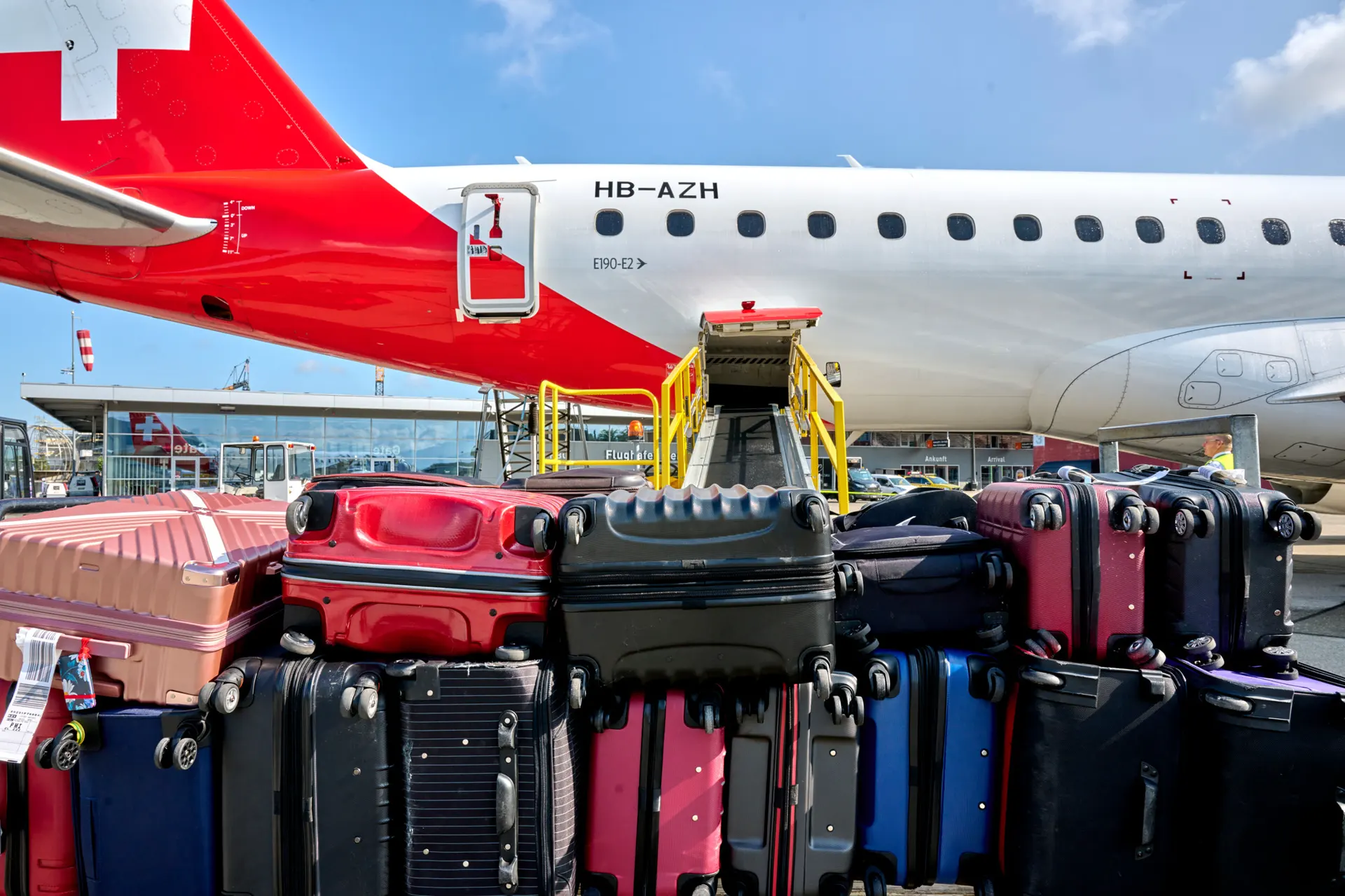 Ferien und Belp, da war doch was: Flugzeug und Koffer am Flughafen Bern-Belp. (Foto: Adrian Moser)