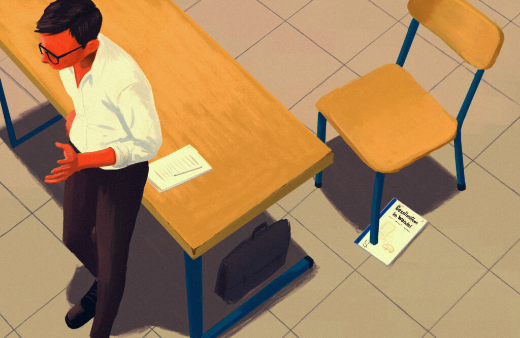 Zum einen habe ich das Geschichtslehrmittel längst in den Schrank verstaut. Noch in der dritten Woche klage ich nämlich mal an einem voll besetzten Mittagstisch, dass es mir schwerfalle, «Gesellschaften im Wandel» sinnvoll zu verwenden. Ich erhoffe mir Tipps, ernte aber bloss mitleidige Blicke. Dass dieses Lehrmittel unbrauchbar ist, ist offenbar Konsens. Werner – knapp sechzig, weisser Schnauz, Kurzarmhemd, Vollblutreallehrer – schaut von seinem Tupperware auf und drückt es wie folgt aus: «Mit diesem Scheissdreck musst du auch nicht meinen, unterrichten zu können.» Ich frage in die Runde, wie es denn mit den übrigen Lehrmitteln aussehe. Das einzige Lehrmittel, das einen bedingungslosen Tauglichkeitsstempel erhält, ist das für Mathematik. Auch ich werde es noch schätzen lernen.