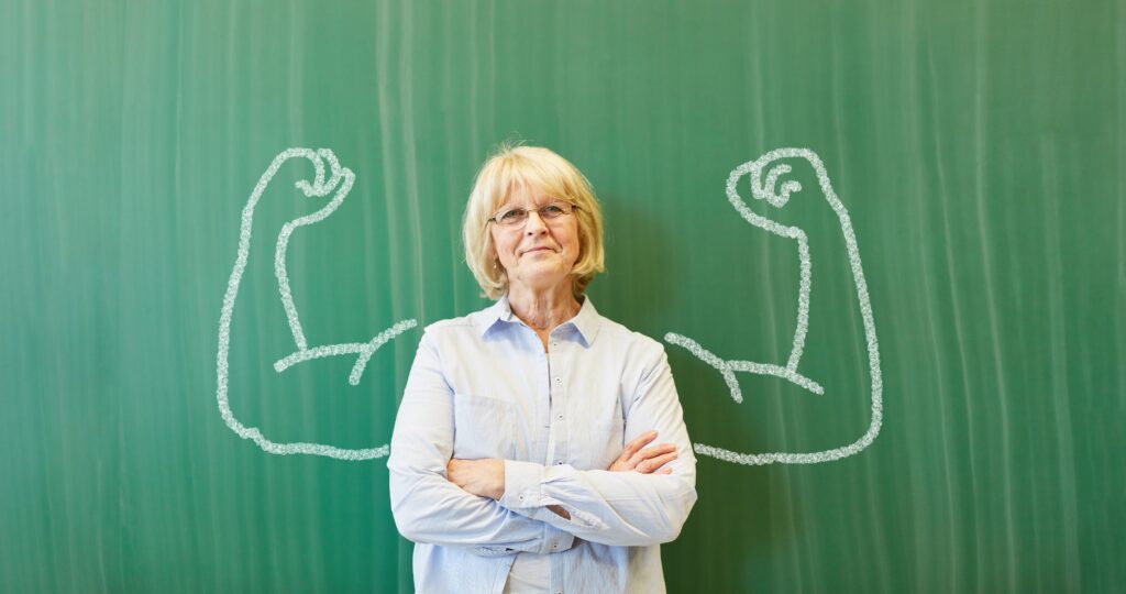 Older woman with crossed arms in front of a green chalkboard, framed by large chalk-drawn flexed arms behind her.