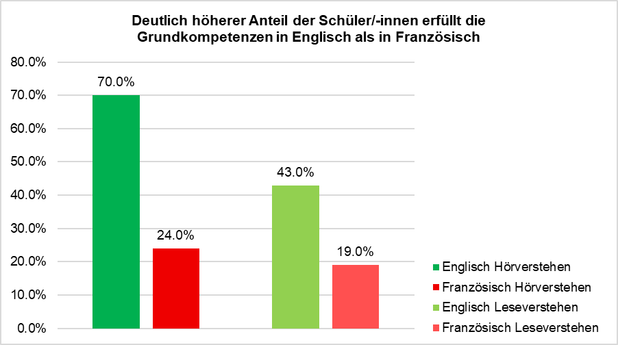 Die Ausgangslage ist unmissverständlich: Die im Bericht präsentierten Zahlen zeigen deutlich, dass Schüler/-innen in Englisch wesentlich bessere Leistungen erzielen als in Französisch.