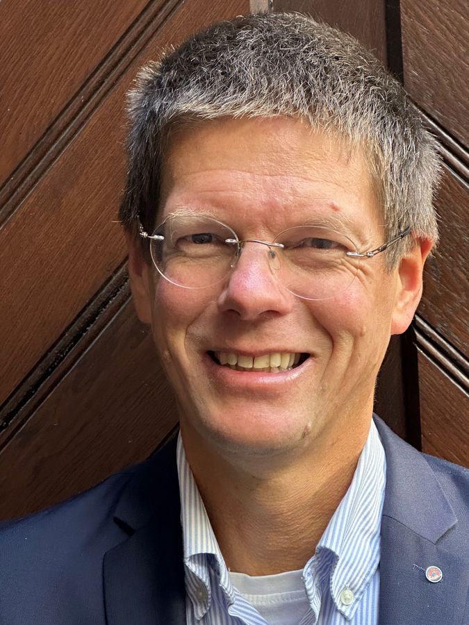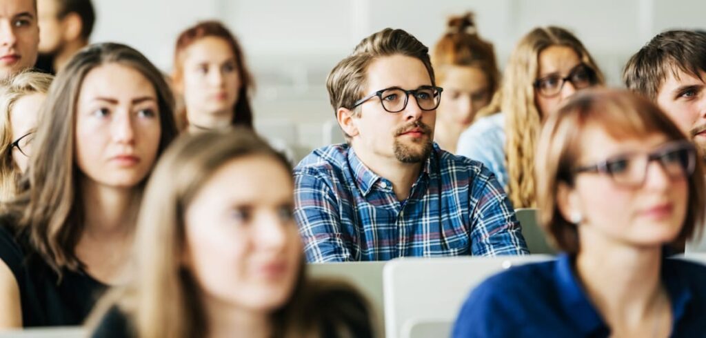 Classroom full of students listening attentively, centered on a man wearing glasses and a blue plaid shirt.