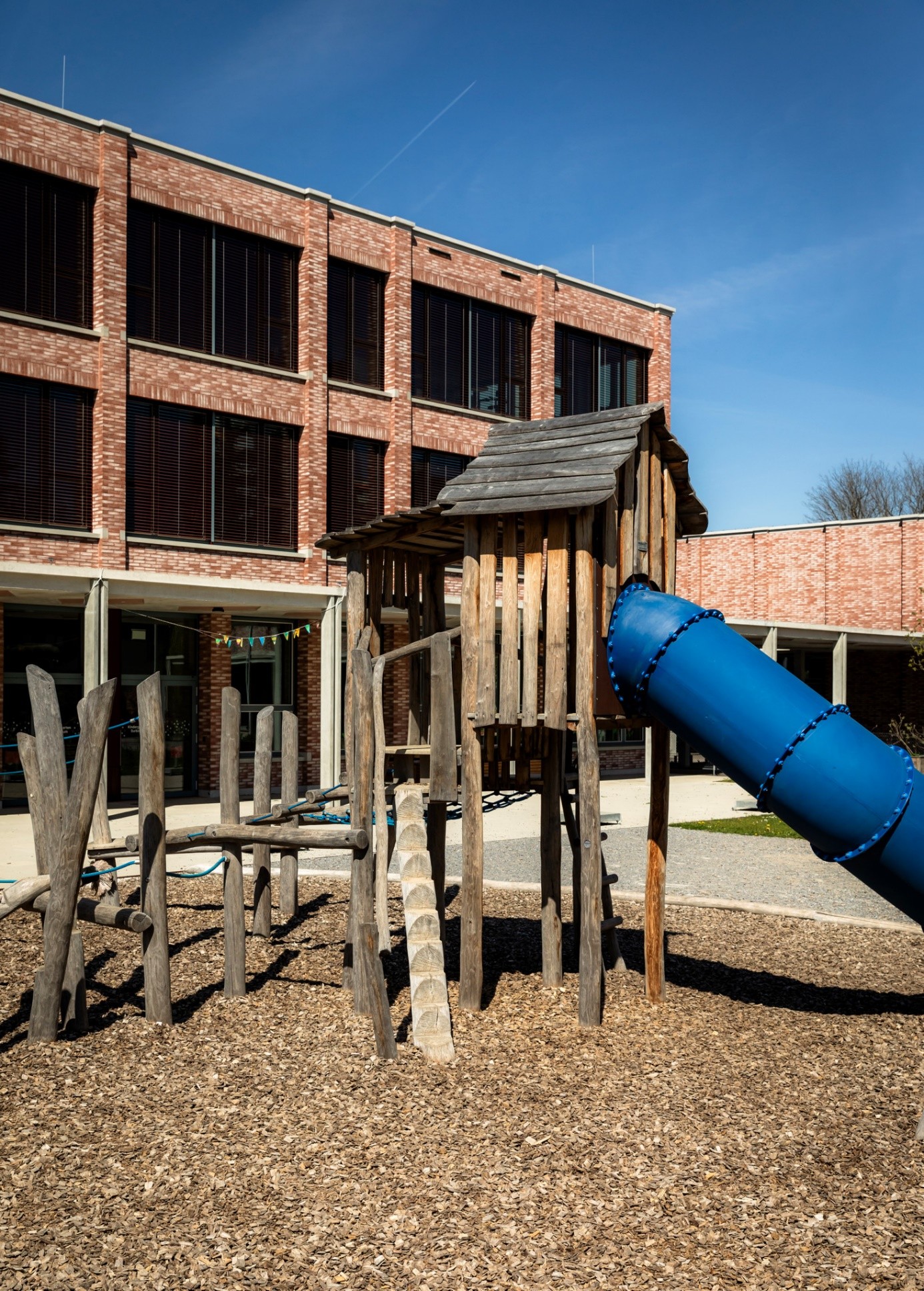 Spielplatz mit Holzturm und blauer Röhrenrutsche vor der Primarschule Surbaum in Reinach, Backsteinfassade im Hintergrund. Die Primarschule Surbaum kostete 2,7 Millionen Franken pro Klassenzimmer. (Foto: Kostas Maros)