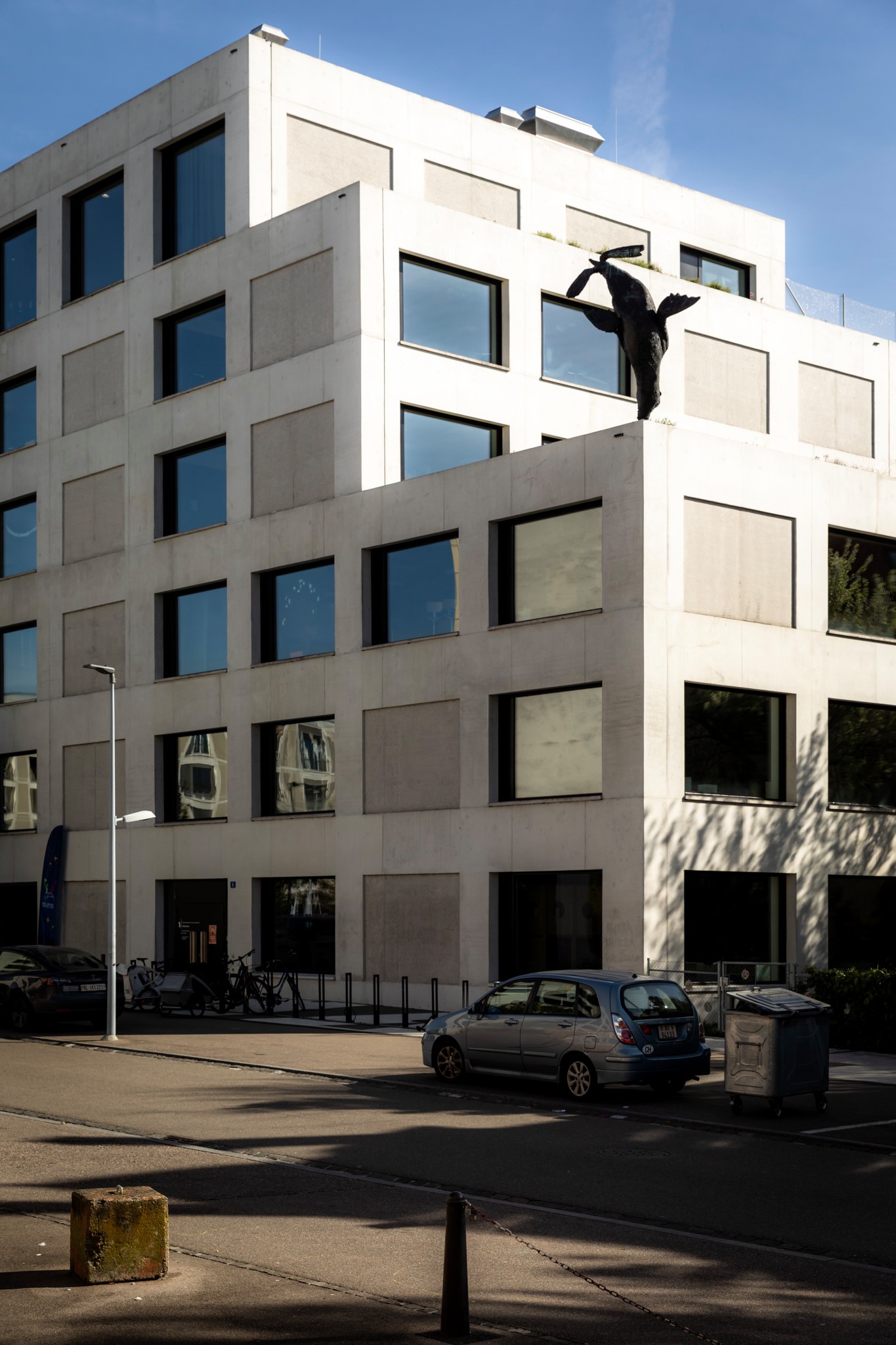 Aussenansicht der Schule Erlenmatt Basel: modernes, helles Gebäude mit grosser Skulptur auf dem Dach und geparktem Auto davor. Die 2017 eröffnete Primarschule Erlenmatt kostete 3855 Franken pro m². (Foto: Kostas Maros)