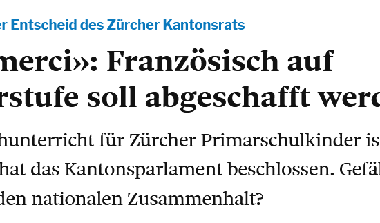 Der Entscheid des Zürcher Kantonsrats wirft Wellen. Nicht nur im Welschland. Auch bei den Involvierten. Die Schweiz steht am Abgrund. Und warum? Weil Zürcher Kinder künftig erst in der Oberstufe lernen, dass bonjour nicht das Maskottchen eines Freizeitparks ist. So jedenfalls klingt es, wenn Erziehungswissenschaftlerin Christine Le Pape Racine den Fremdsprachenentscheid des Zürcher Kantonsrats kommentiert. Ein Zwischenruf von Condorcet-Autor Carl Bossard.